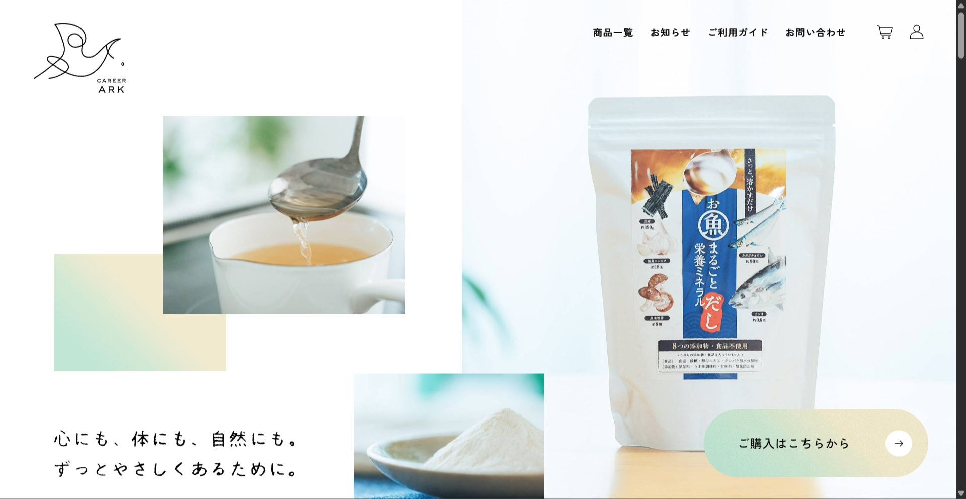 いわし・かつお・昆布などの素材を目玉や骨まで丸ごと微粉末化し、さらにペプチド化されたタンパク質で、体への吸収効率も抜群。