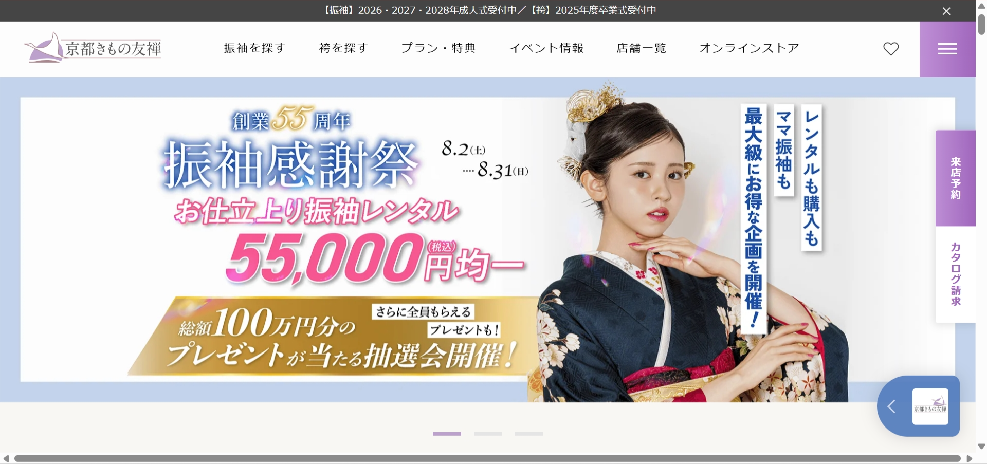 お客様満足度99.8%の実績!豊富な振袖ラインナップと丁寧な接客で、理想の一枚に出会える振袖専門店です。