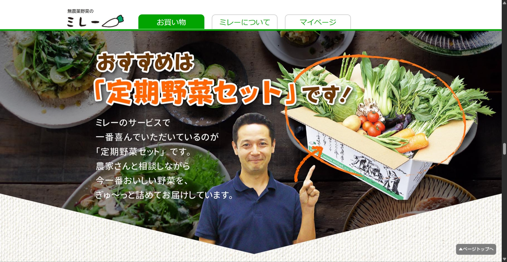 マスコミ取材多数の「無農薬野菜ミレー」は、農薬を使わず丁寧に栽培した旬の野菜を朝採れでその日のうちに発送。鮮度と安全性にこだわる方へ、産地直送の美味しさをお届けします。