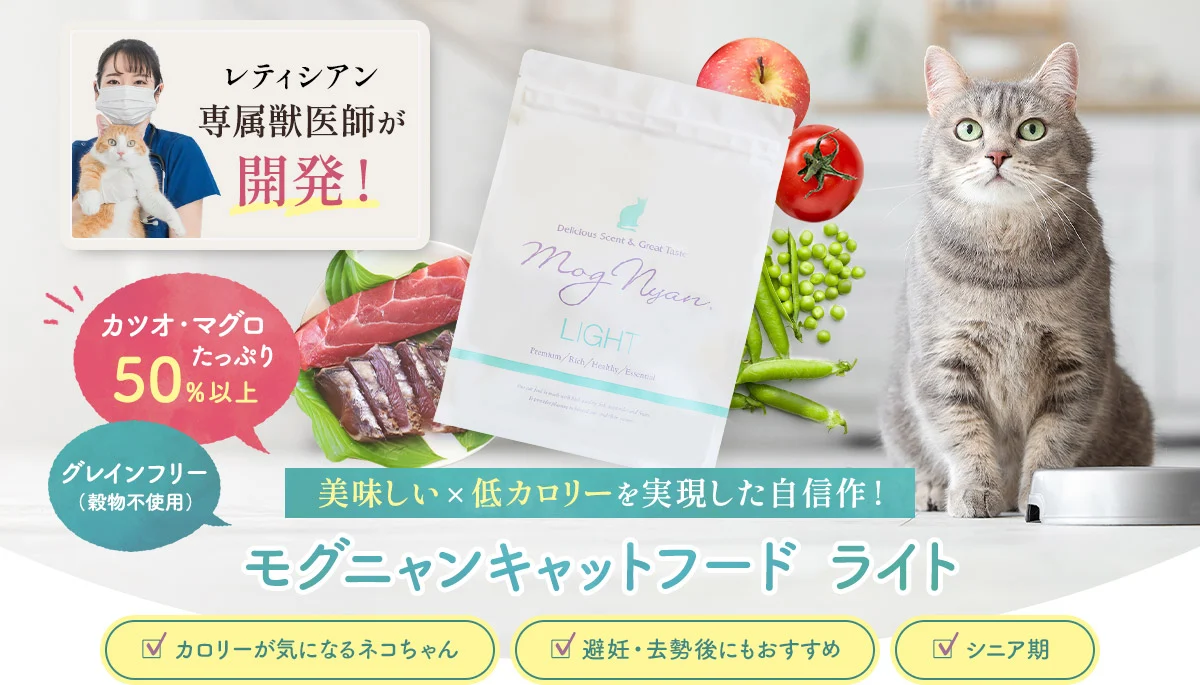 【モグニャンキャットフードライト】は、食いつき抜群ながら低カロリー設計で、体重管理をサポートする新しいキャットフードです。