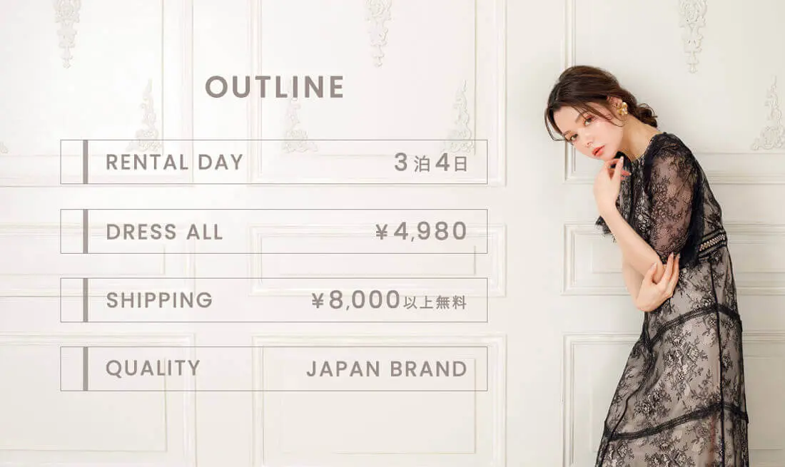 - 小物レンタル:バッグ・アクセサリー・羽織り物までまとめてコーデ可能。